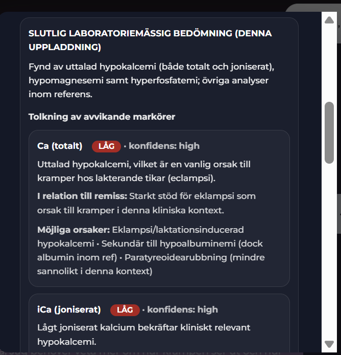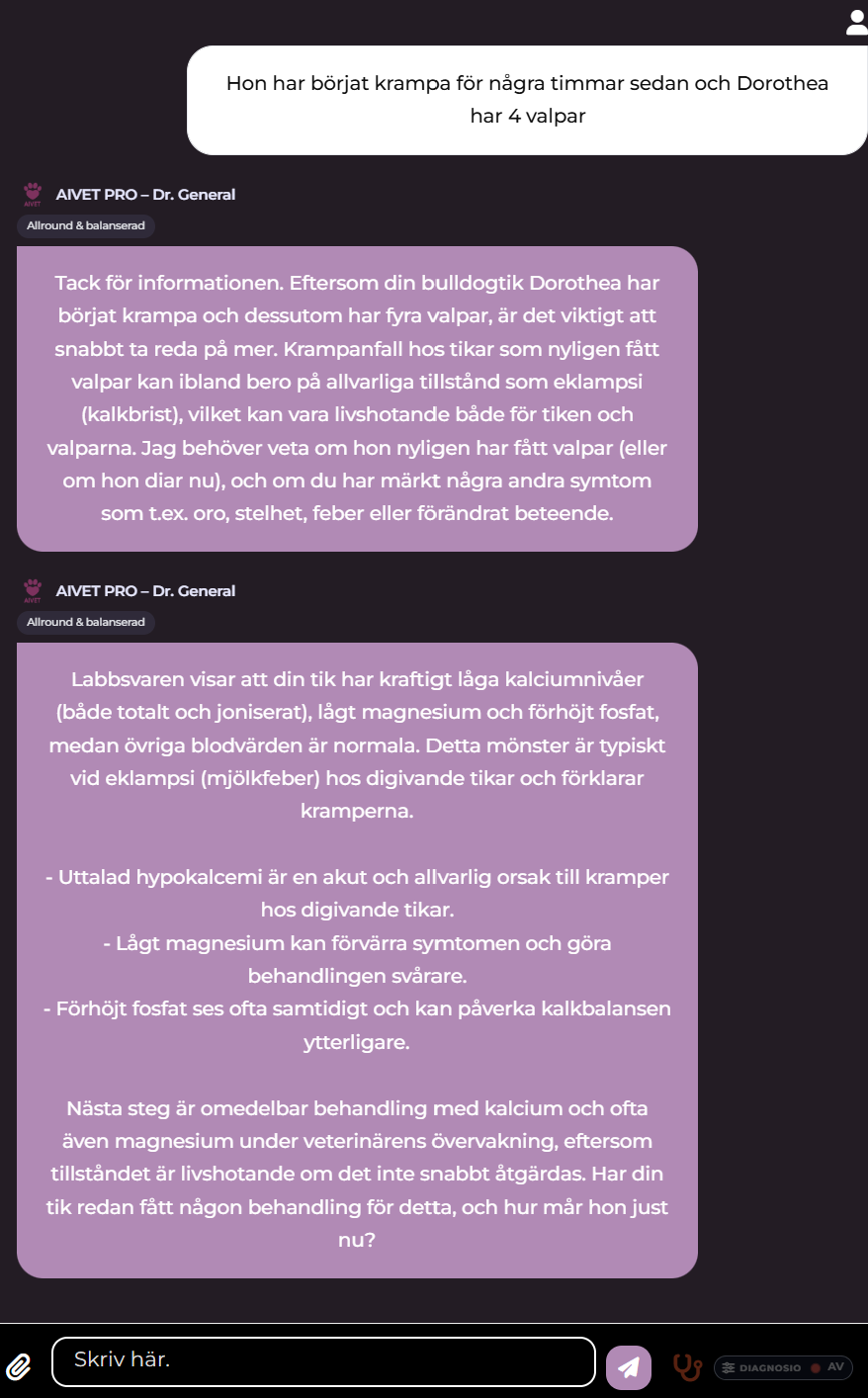 Labora Labservice har utgått från chatt med din doktor som har en frågeställning du vill utreda. I detta exempel är det en tik som har flera valpar och har börjat krampa. En komplett remiss har producerats. Remissens frågeställning tillsammans med labrapporten du kan ladda upp kommer att tolkas och generera ett remissvar.