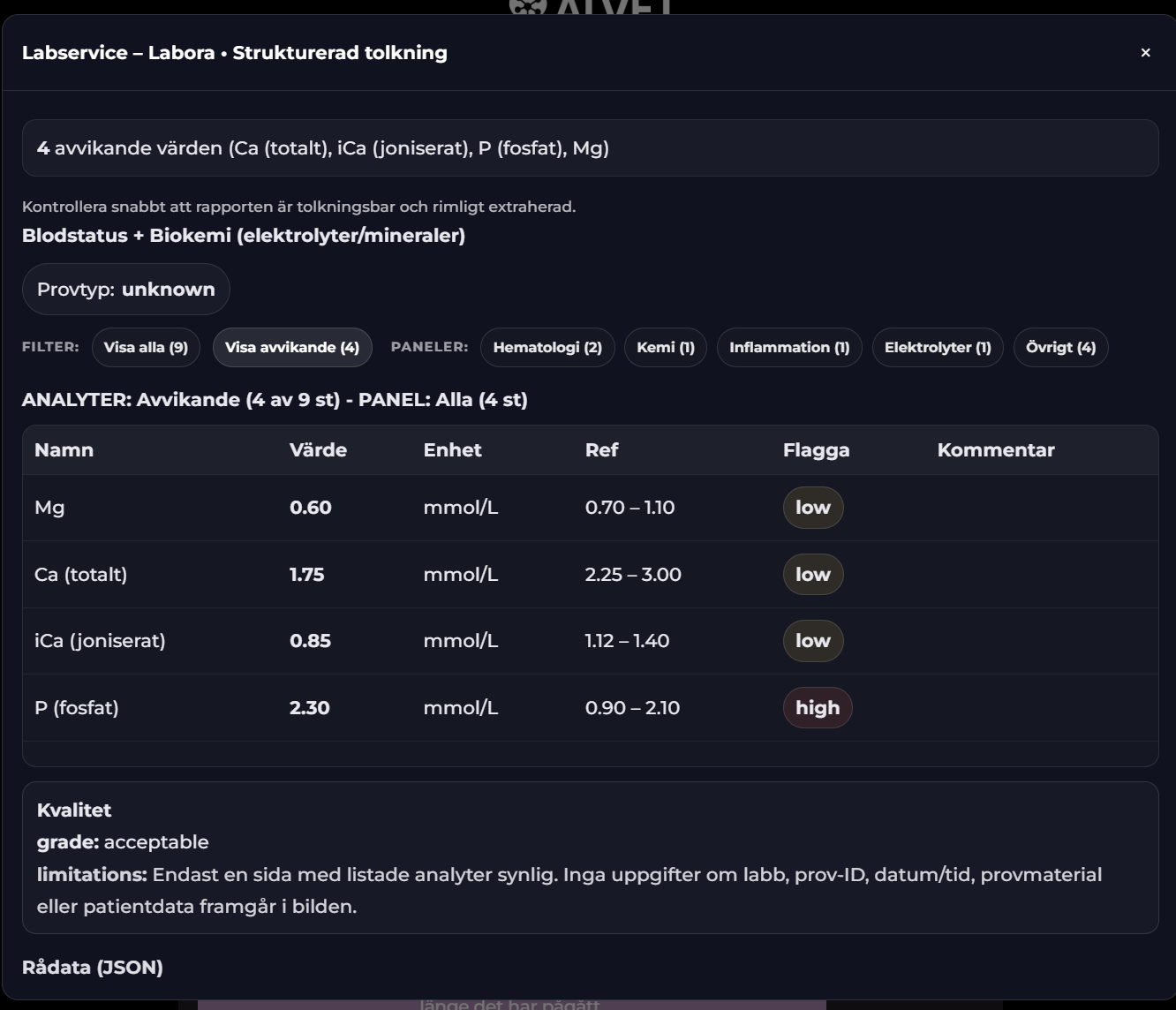 Ladda upp labbrapporten (png, jpg, pdf, txt...) och klicka tolka labrapport.