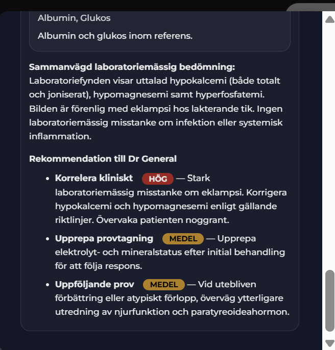 AI doktorn föreslår diagnostisk åtgärd och producerar en remiss. Remissen går till Labora som tolkar din labrapport (png, jpg, pdf, txt....) och producerar komplett remissvar.