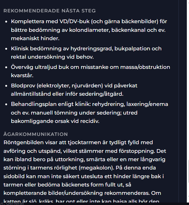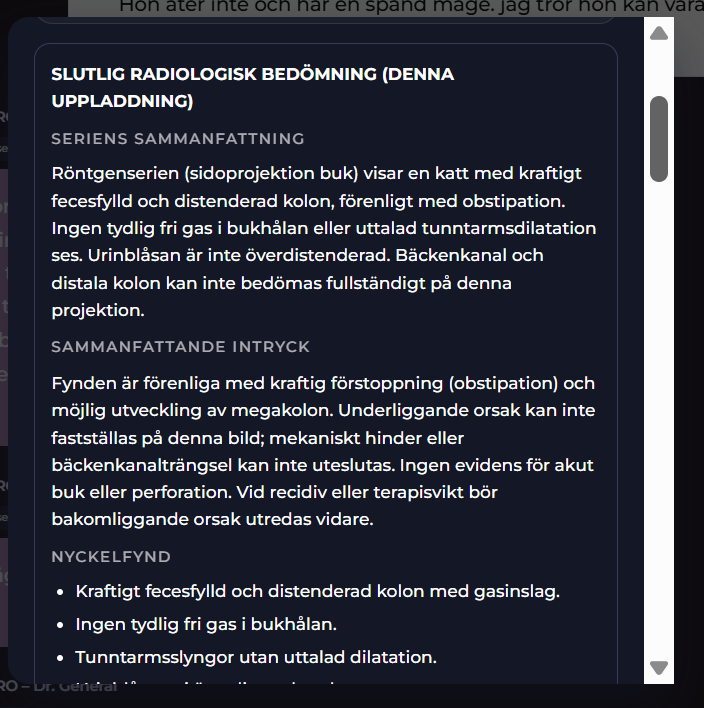 Radiologica Röntgentolk har utgått från chatt med din doktor som har en frågeställning som ska utredas. I detta exempel är det en katt som kan vara förstoppad. En komplett remiss har producerats. Remissens frågeställning tillsammans med röntgenbilder du kan ladda upp kommer att tolkas och generera ett remissvar.