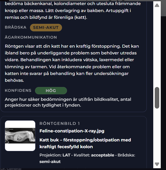 Vi även lagt till att det faktiskt tas röntgenbilder baserat på remissen och AI-doktorns rekomendation baserat på denna. Detta sker självklart inte samtidigt i praktiken då djurägaren först måste komma in till kliniken och göra dessa föreslagna röntgenbilder.